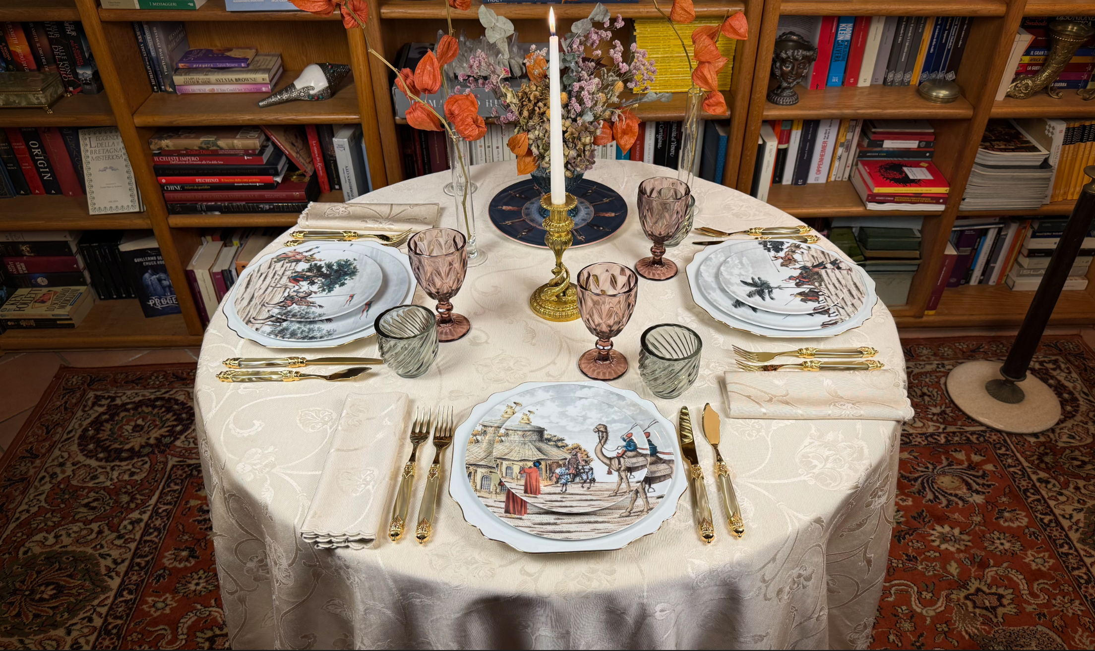 Allestita tra libri e racconti, Tavola Corteo celebra il piacere di una cena intima e colta.