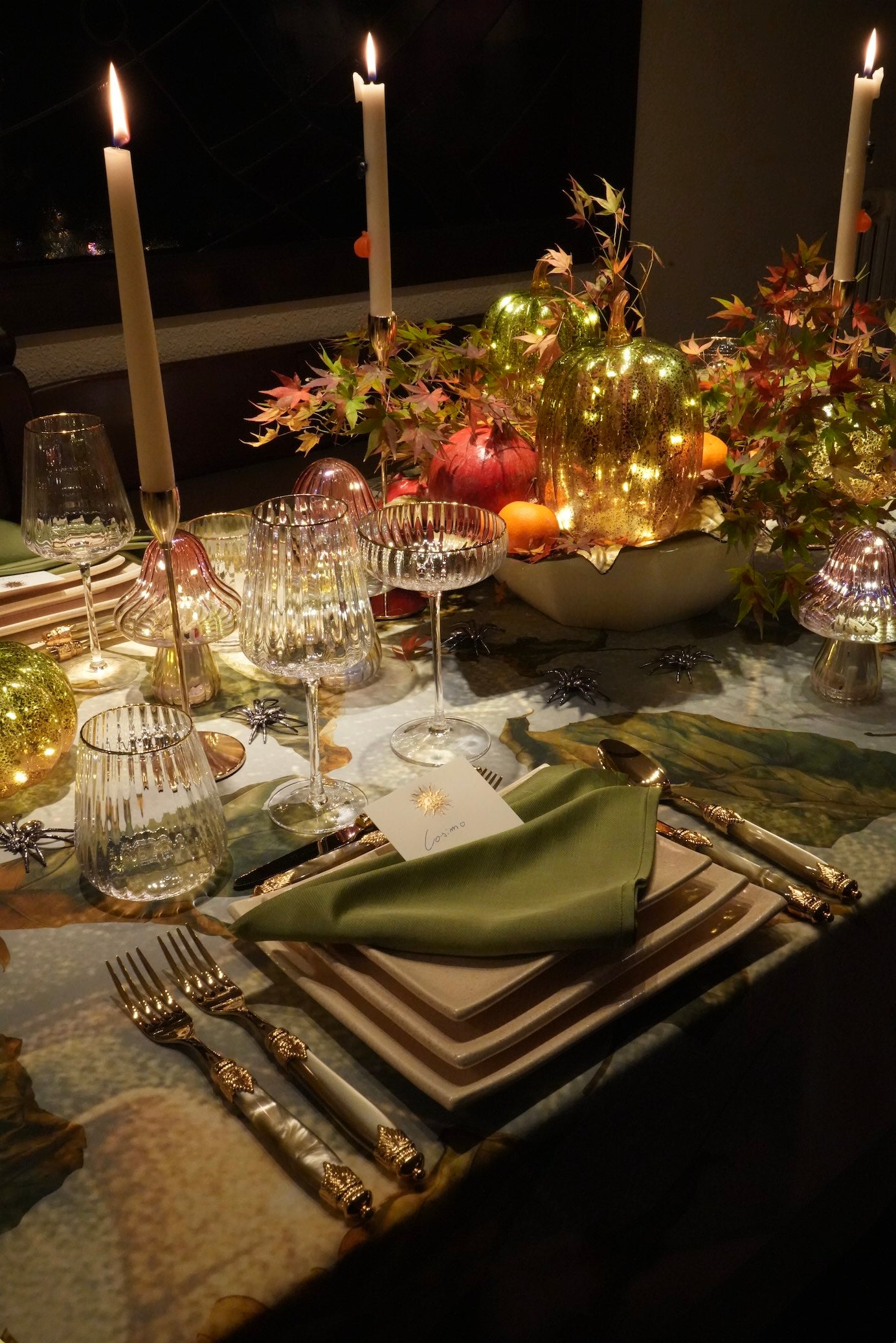 Tra riflessi dorati, melograni accesi e foglie che raccontano il cambio delle stagioni, ogni dettaglio prende vita nella luce calda di una cena che sa di magia. Cosmic Tables firma un allestimento che unisce natura e luce, equilibrio e stupore, dove ogni elemento è scelto con cura per raccontare una storia.